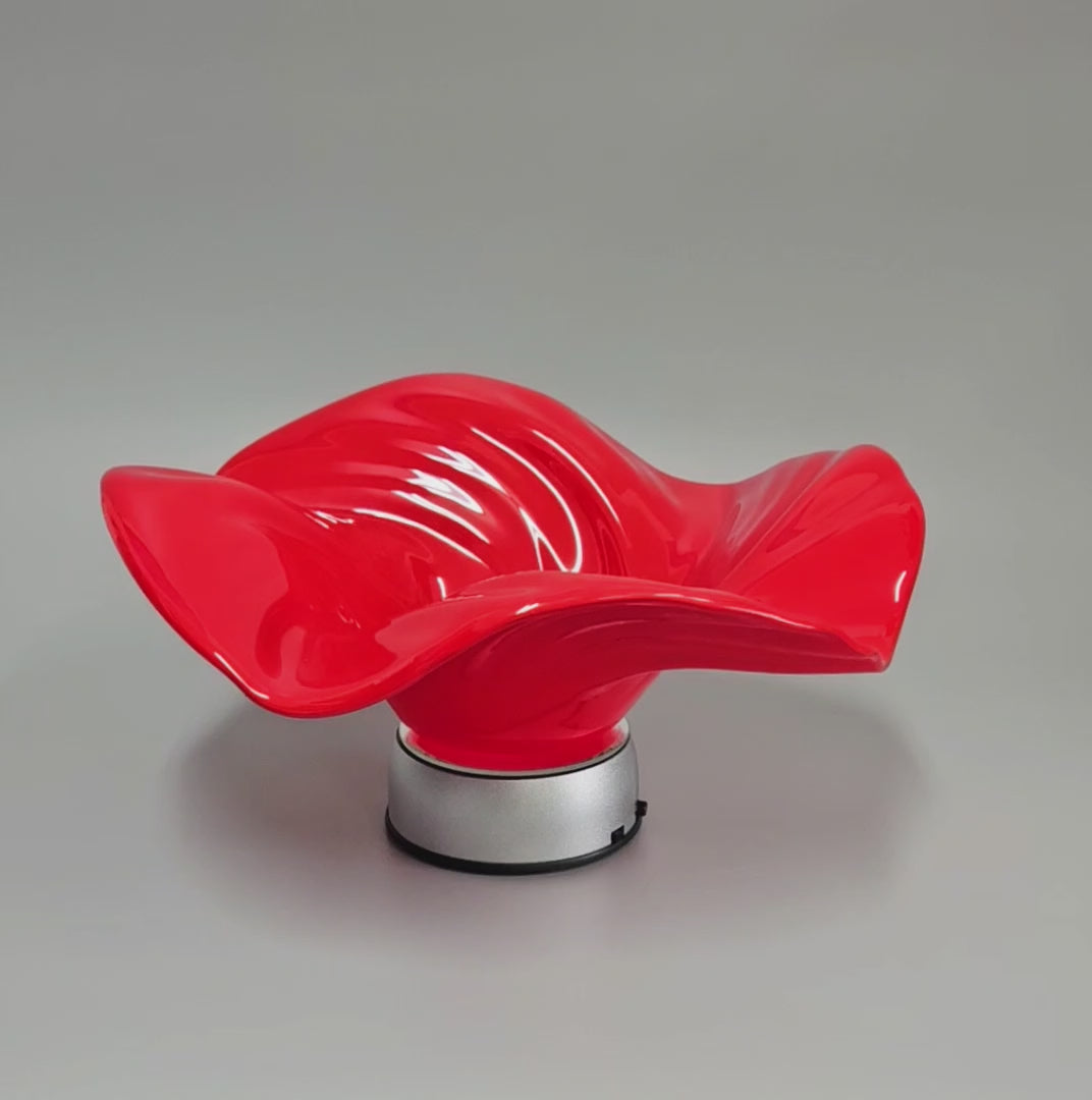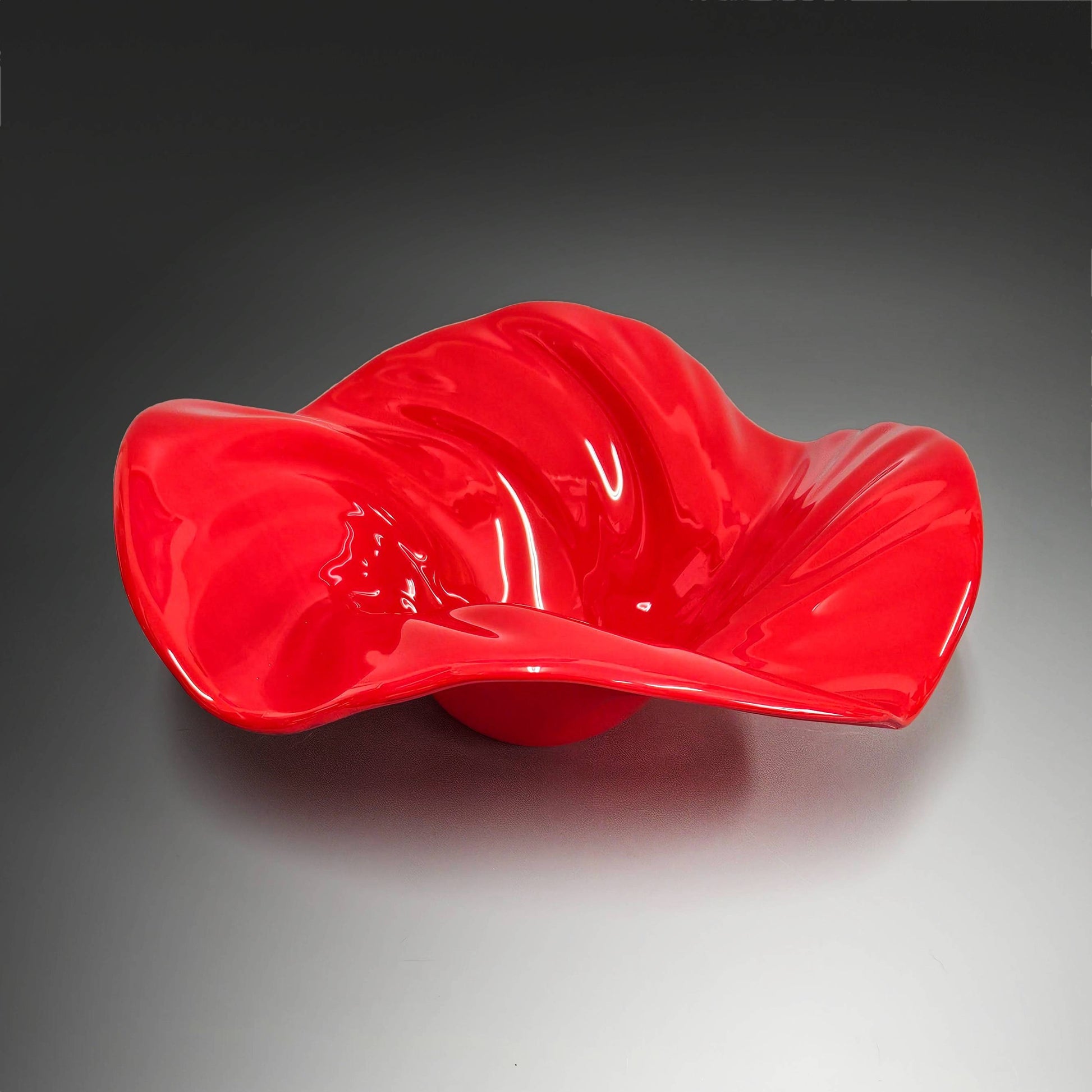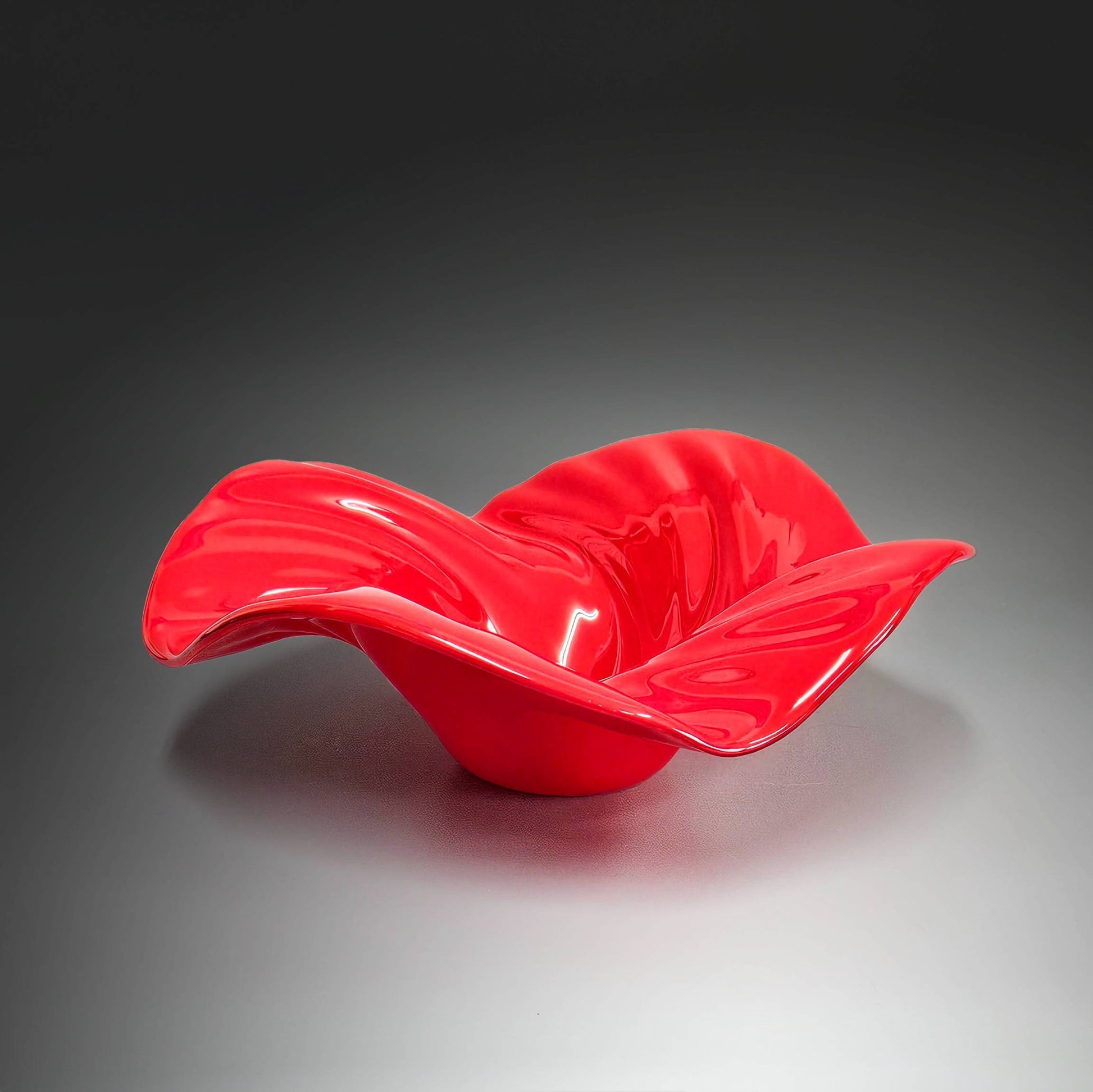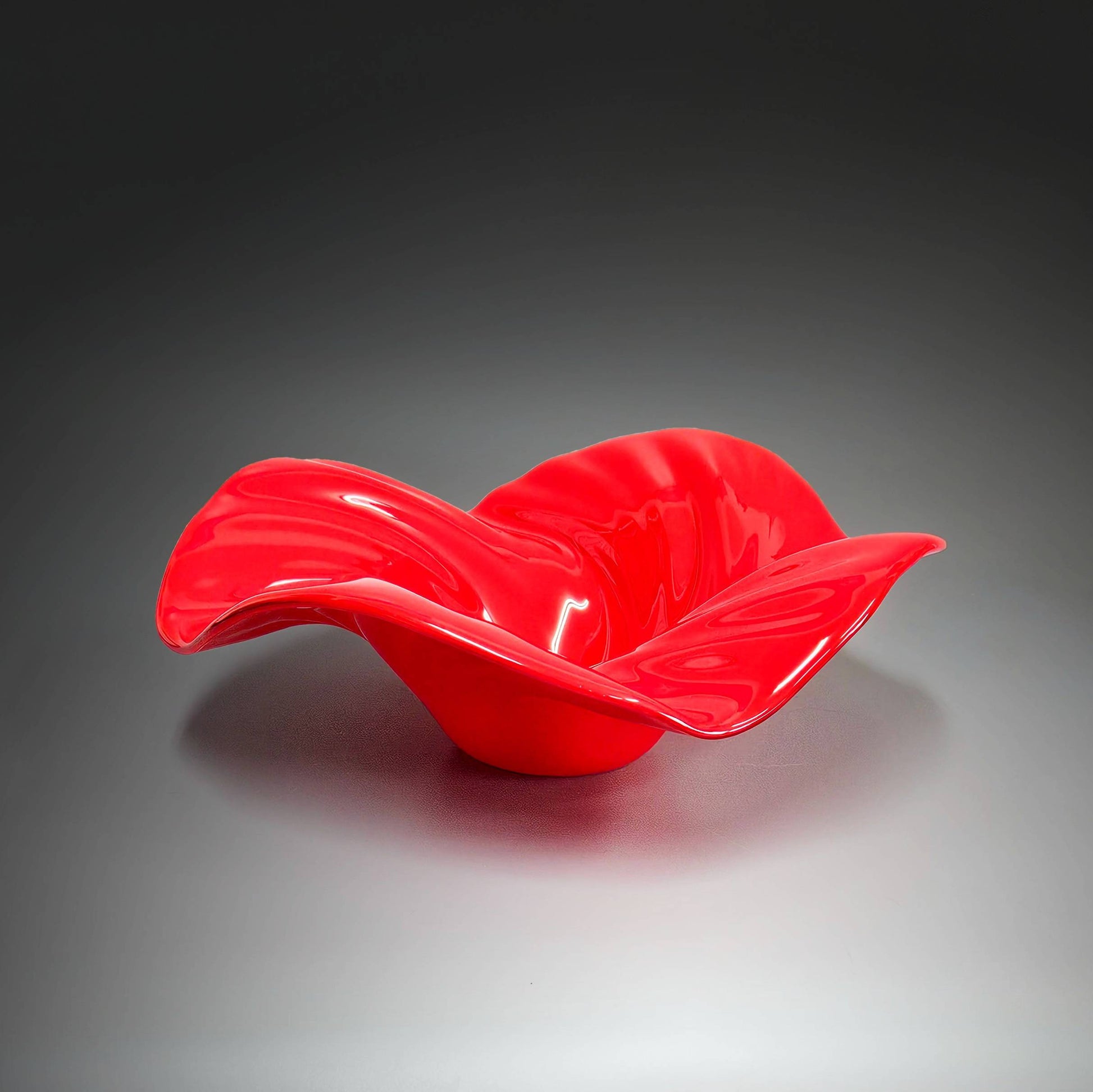 This beautiful glass wave bowl is done in striking shade of bright scarlet red. It's done in an opaque glass which lets the light play off it beautifully. The color is stunning. This decorative glass bowl would look beautiful on your coffee table or side table. Alternately toss a couple of pieces of fruit in it for a beautiful pop of color on your kitchen counter. The wide lipped, waved edge adds a modern touch to this contemporary piece of table décor.