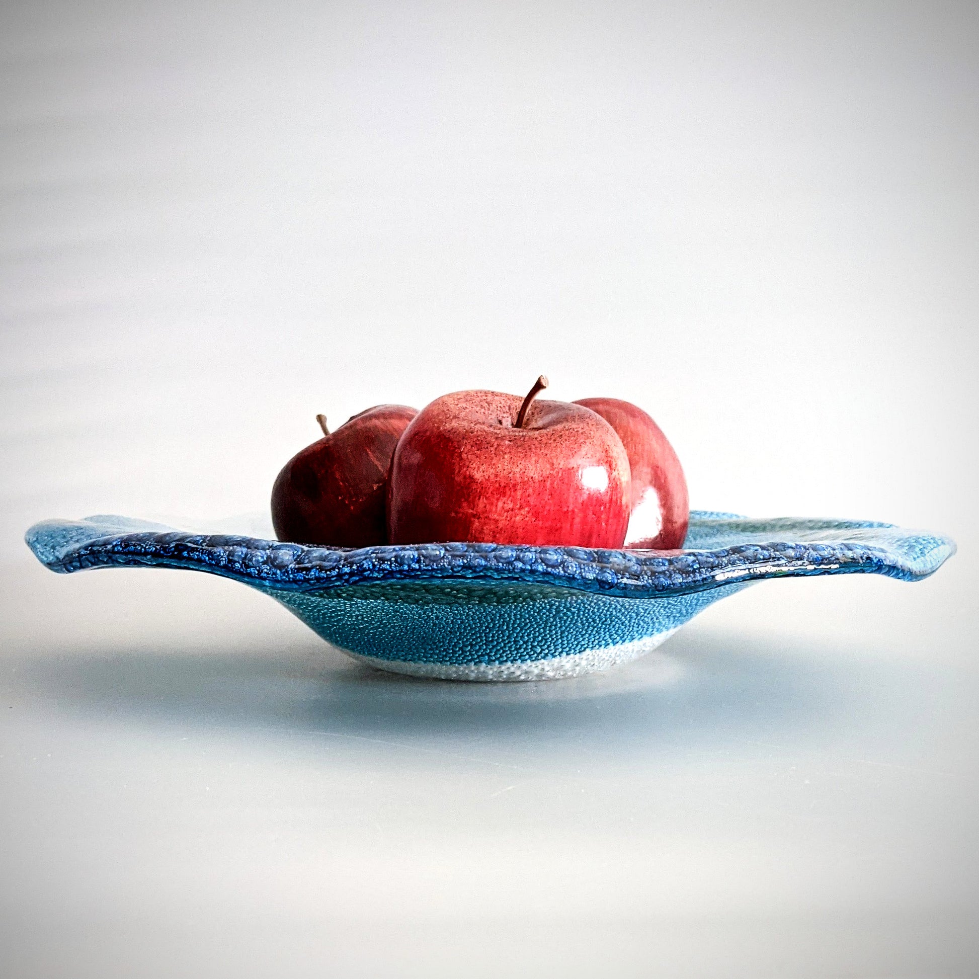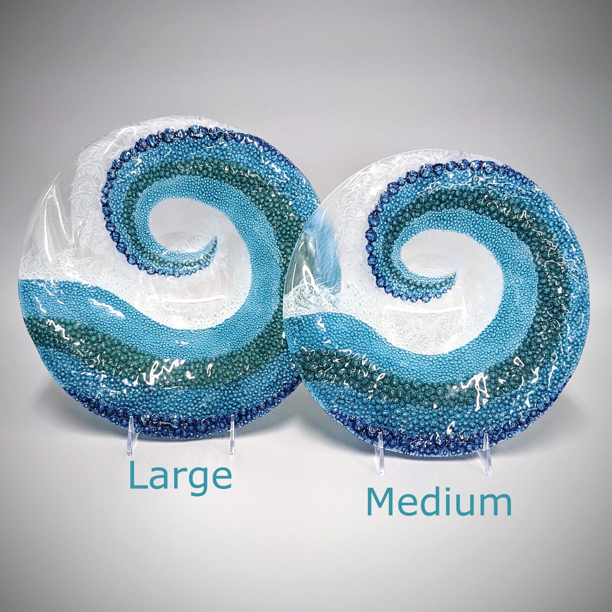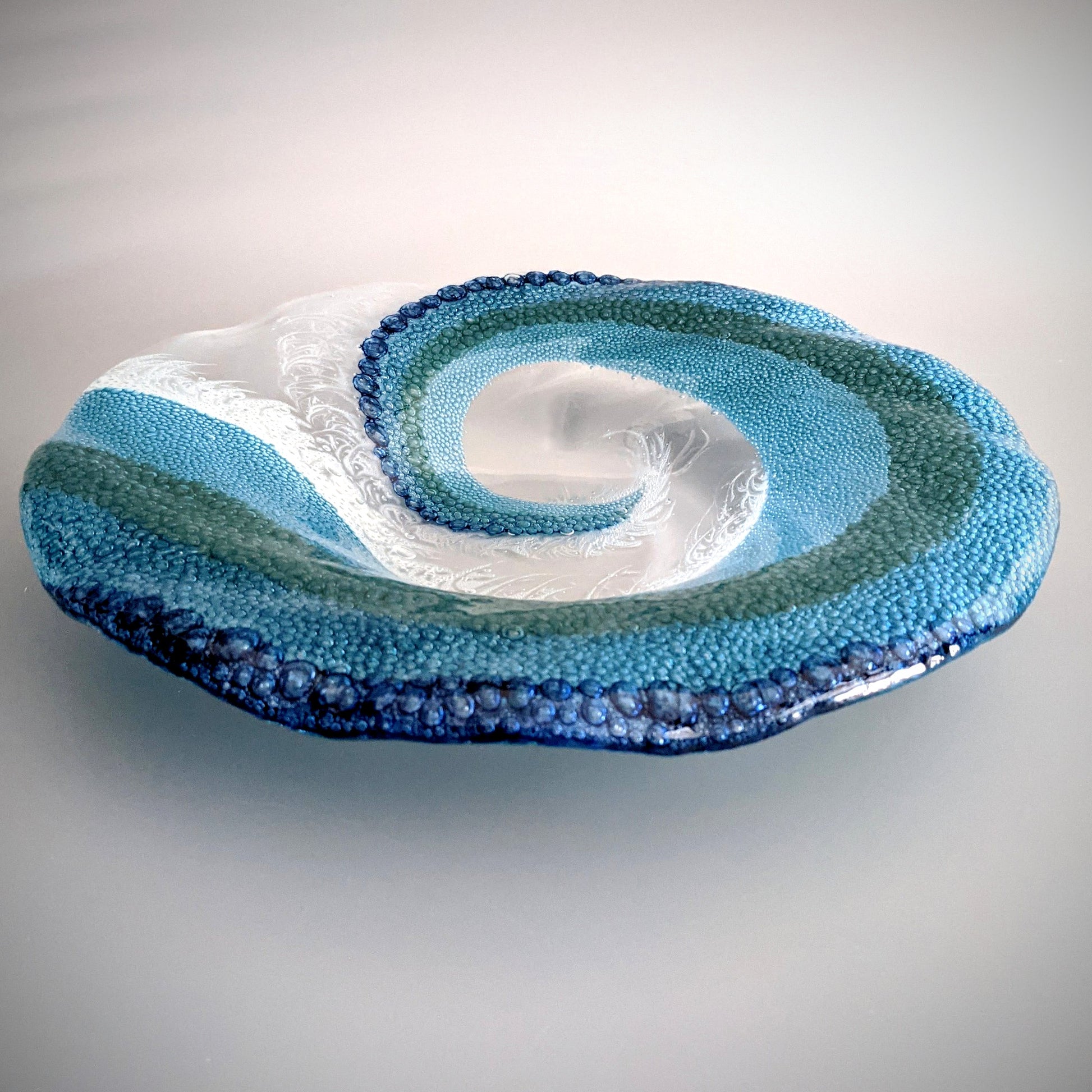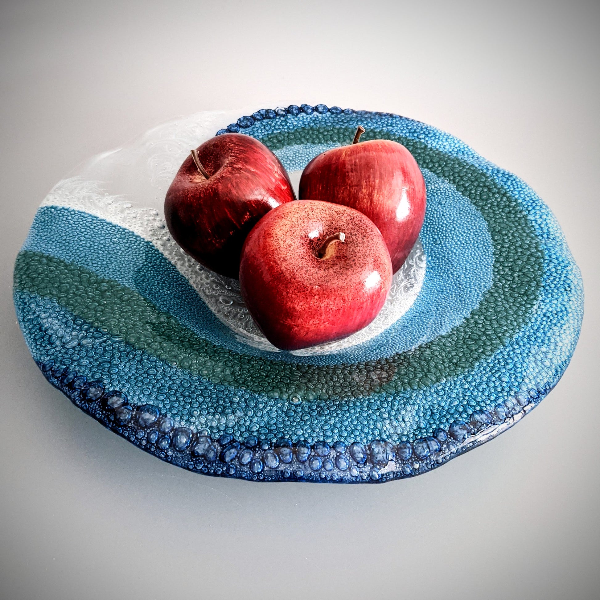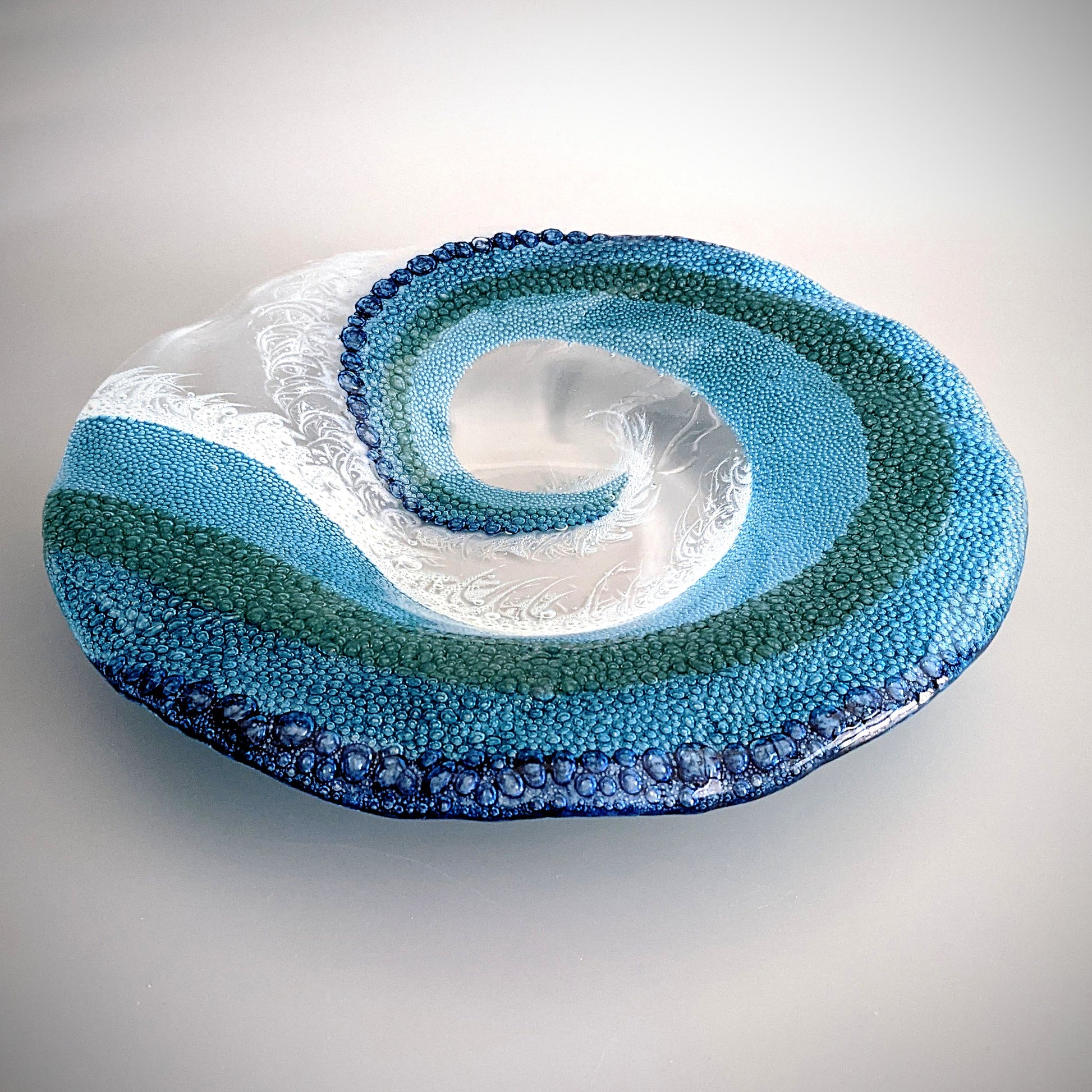 Done in shades of blue green, including turquoise, aqua and sea green. It has 2 layers of clear glass that have been fully fused and annealed for maximum durability. The entire piece was hand painted with glass enamels and treated to force the bubble pattern. The texture and movement of the piece catches light while you catch your very own wave.