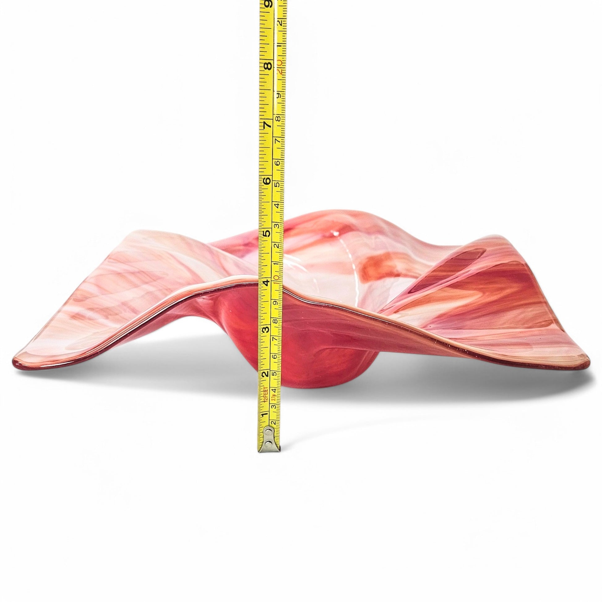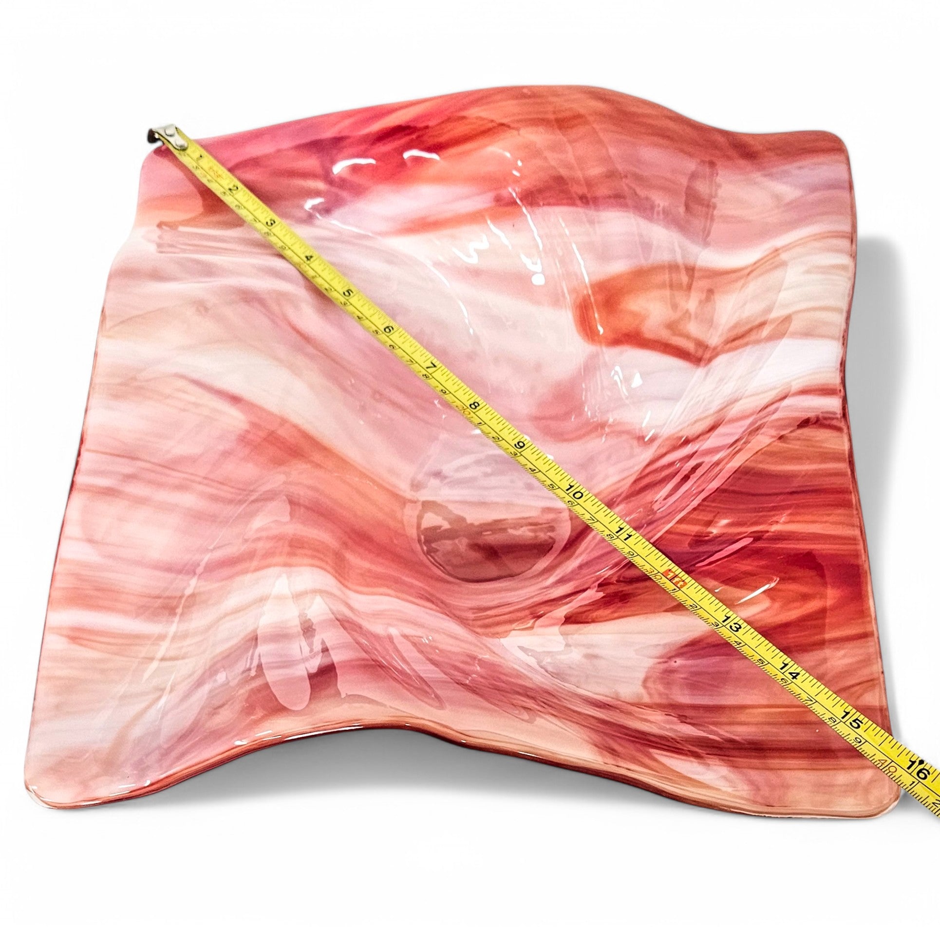 SIZE: Measured diagonally from corner to corner; 16" x 16" (12" squared) and 4" at highest point - Note: Glass tends to pull during the melting process. All sizes are approximate to within 1/4" more or less, of listed dimensions.