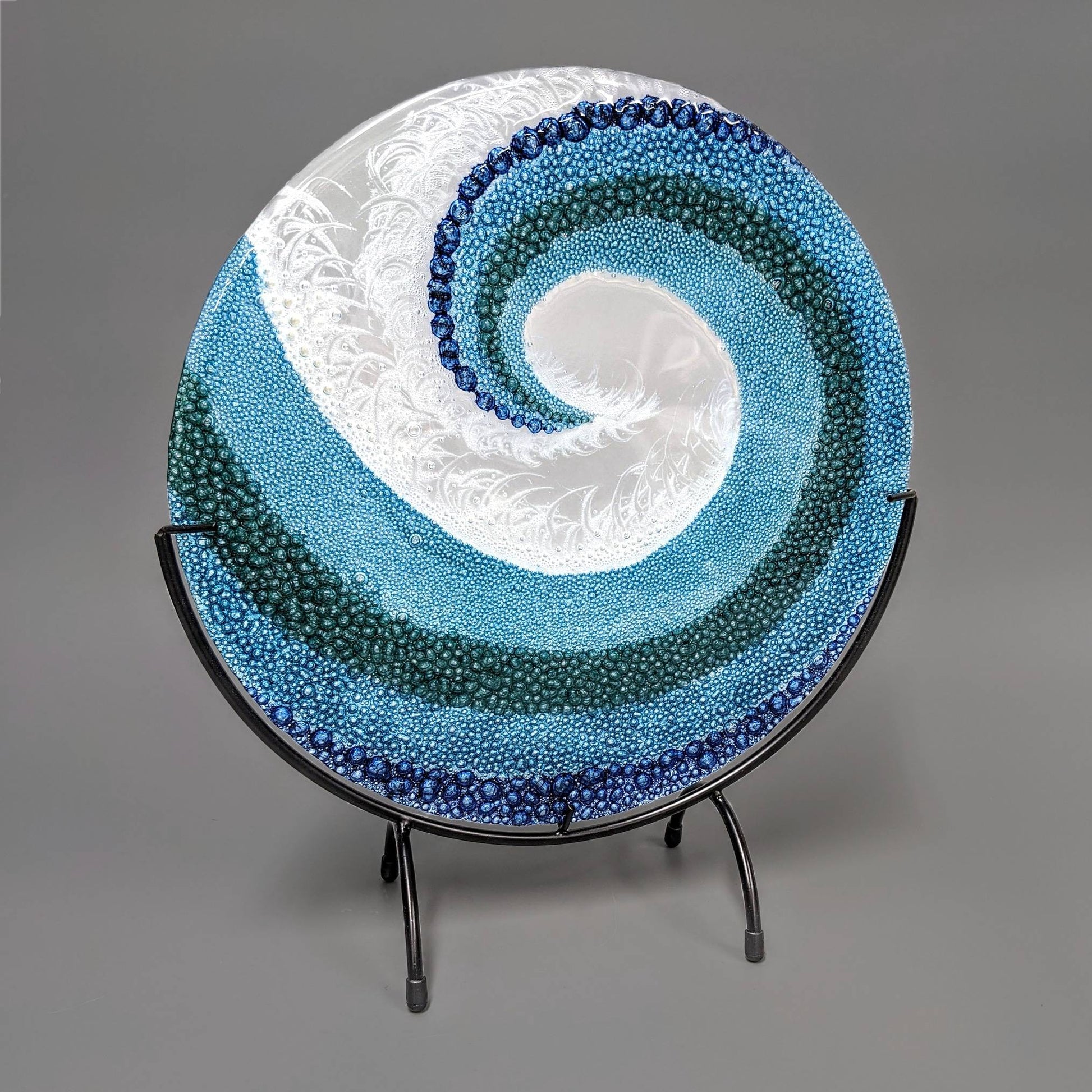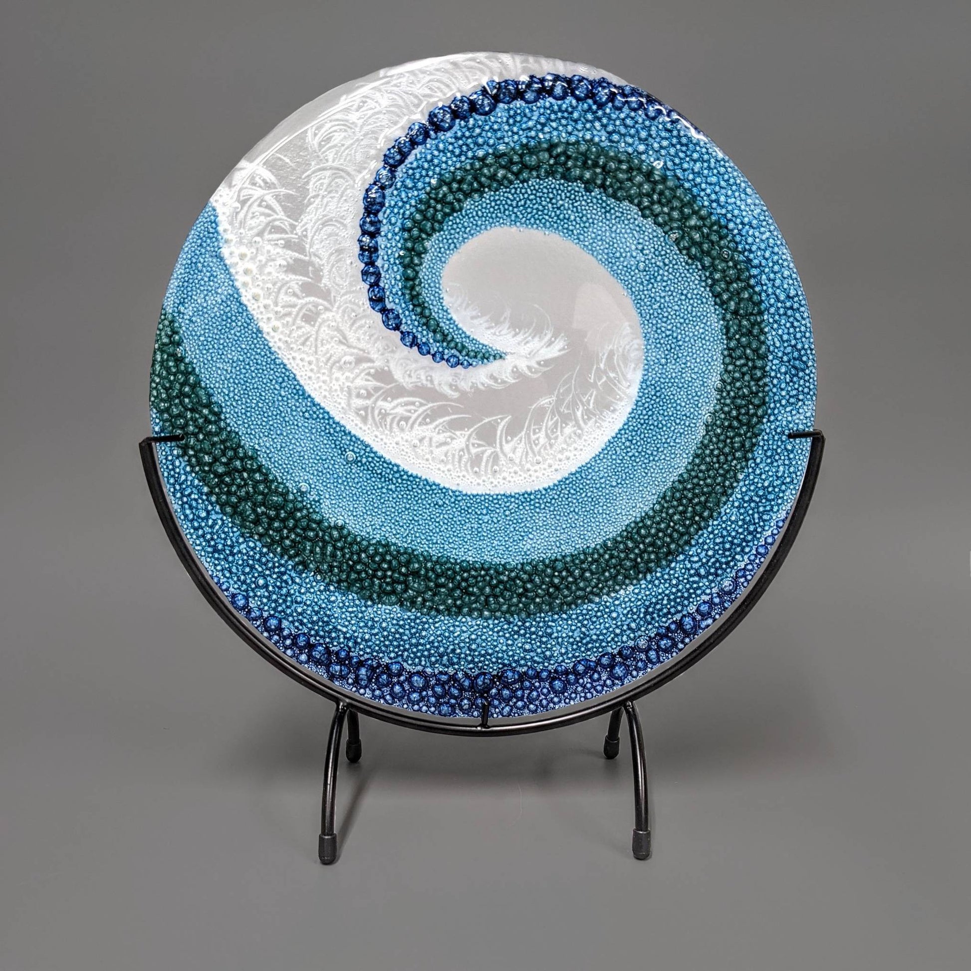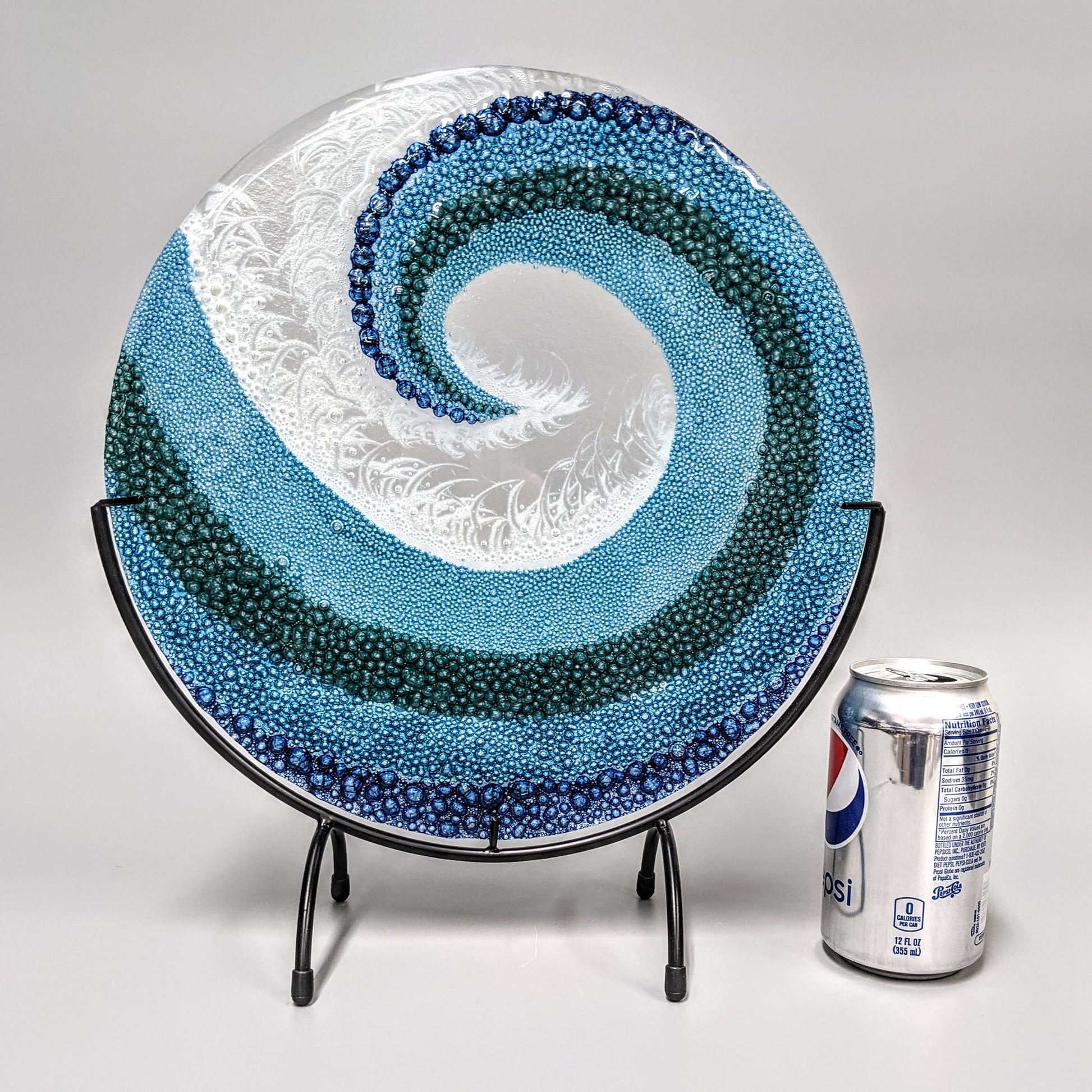 This stunning, round, glass art panel, depicting crashing ocean waves, has 2 layers of clear glass that have been fully fused and annealed for maximum durability. The entire piece was hand painted with crushed glass enamels and treated to force the bubble pattern. The texture and movement of this glass wave catches light while you catch your very own wave. Perfect for any décor, these work especially well for a tropical, beach, surf or coastal theme.