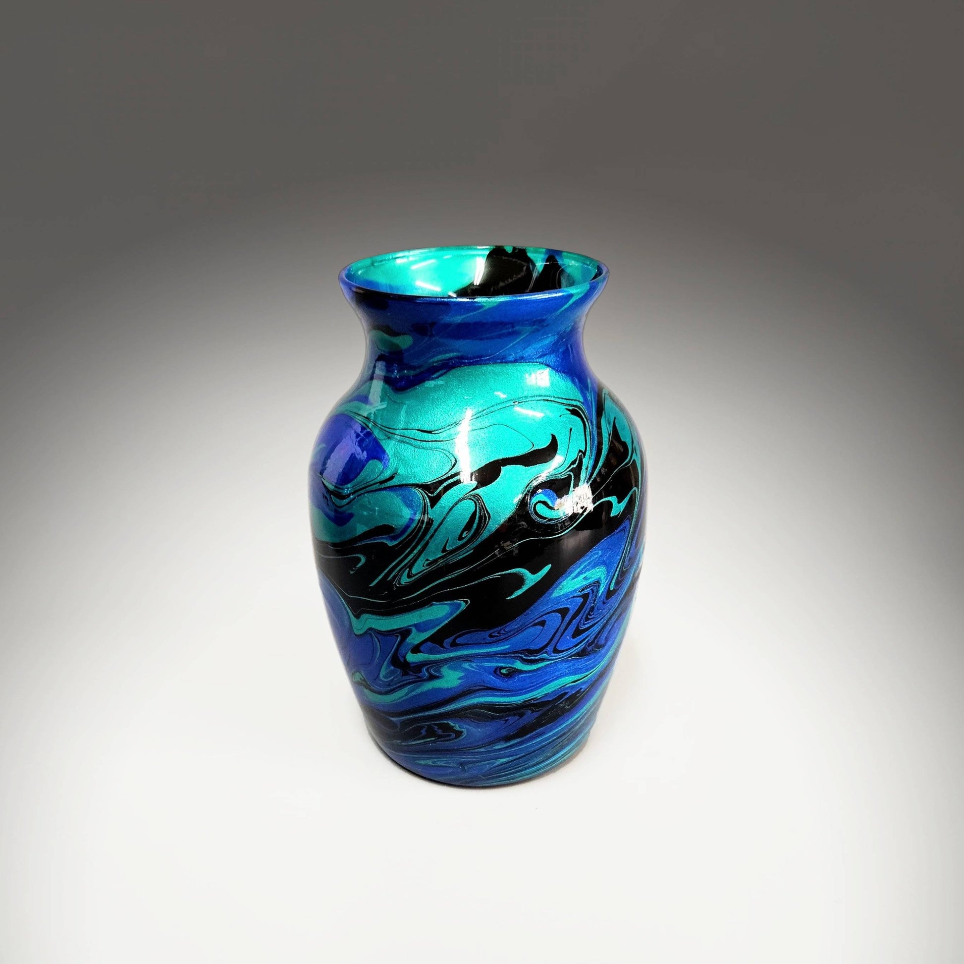 This glass vase is the perfect accent piece for any décor. Unique and one-of-a-kind, you're sure to get many compliments on this stand-out piece of art. Done in a striking mix of teal, aqua, black and turquoise blue, it was hand painted with acrylics, then sealed with three coats of high gloss varnish. The paints have a metallic sheen giving this piece a hint of sparkle. Make it functional art by adding a fresh bouquet of flowers or use it as a stand-alone piece of statement art on your favorite shelf or table.