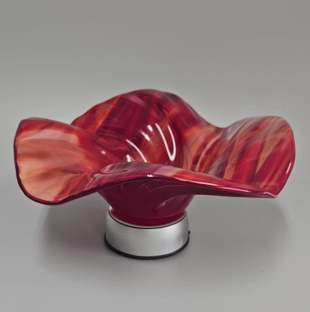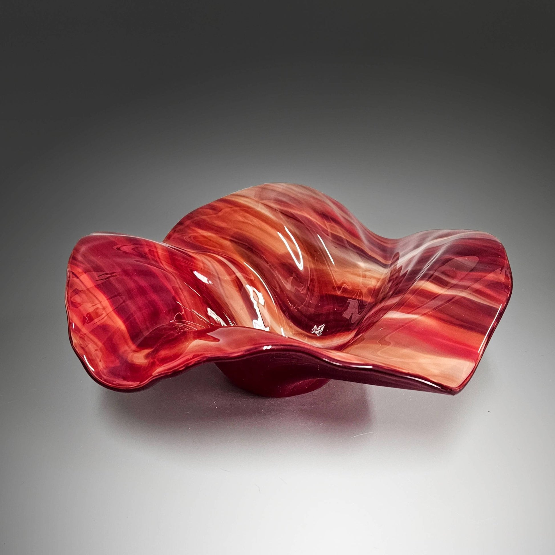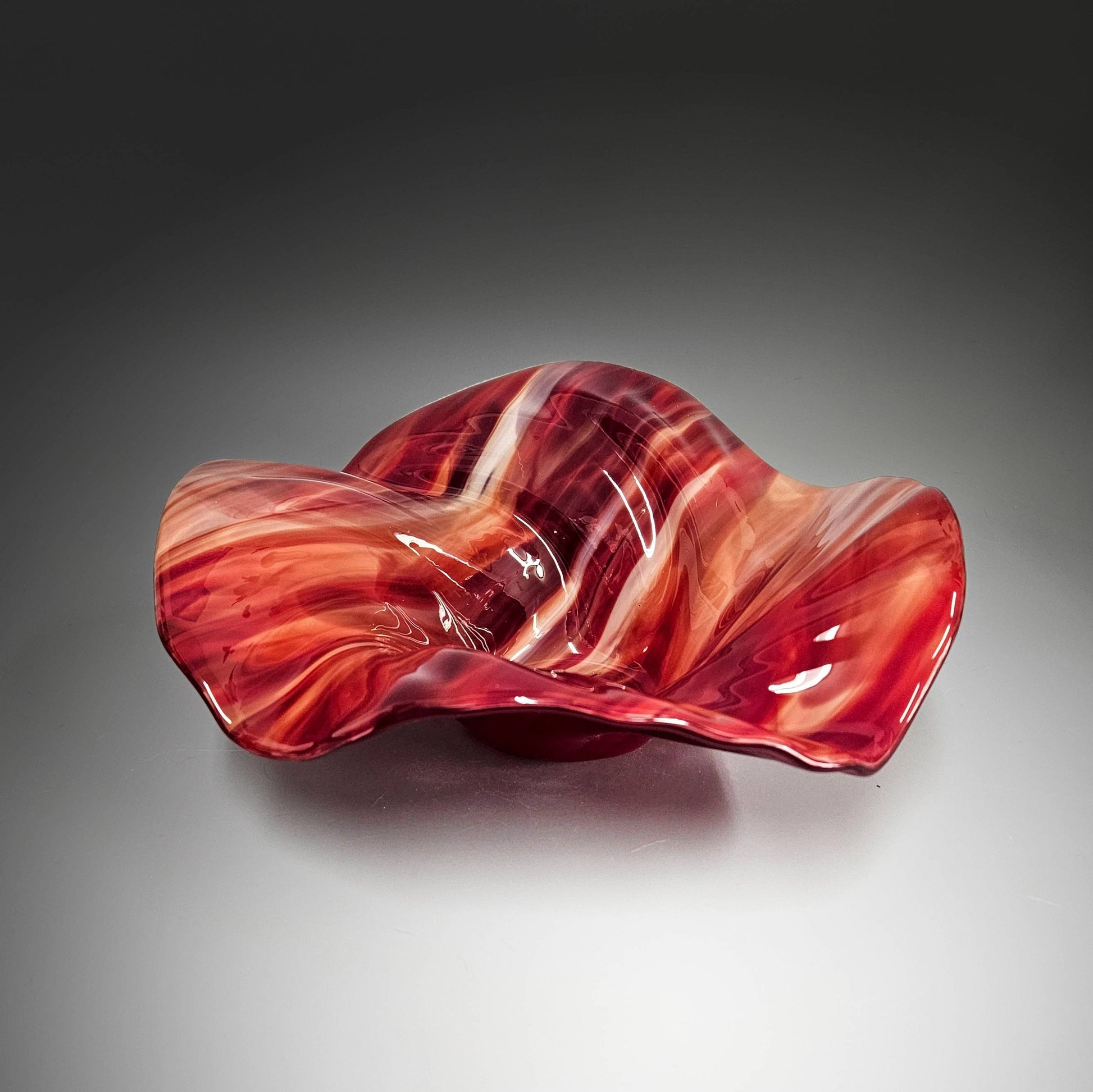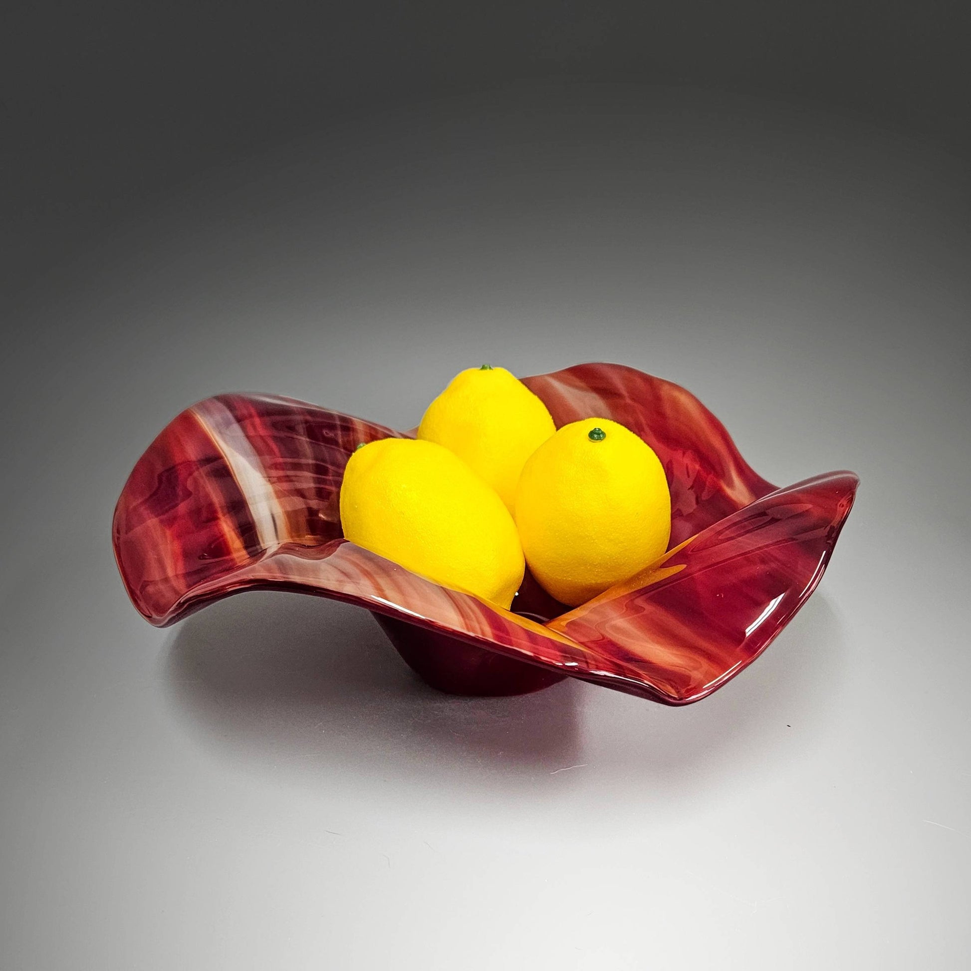 This beautiful glass wave bowl is done in striking mix of shaded reds. It's done in a mix of transparent glass which lets the light play off the swirls in the glass beautifully. The color is stunning. This decorative glass bowl would look beautiful on your coffee table or side table. Alternately toss a couple of pieces of fruit in it for a beautiful pop of color on your kitchen counter. The wide lipped, waved edge adds a modern touch to this contemporary piece of table décor.