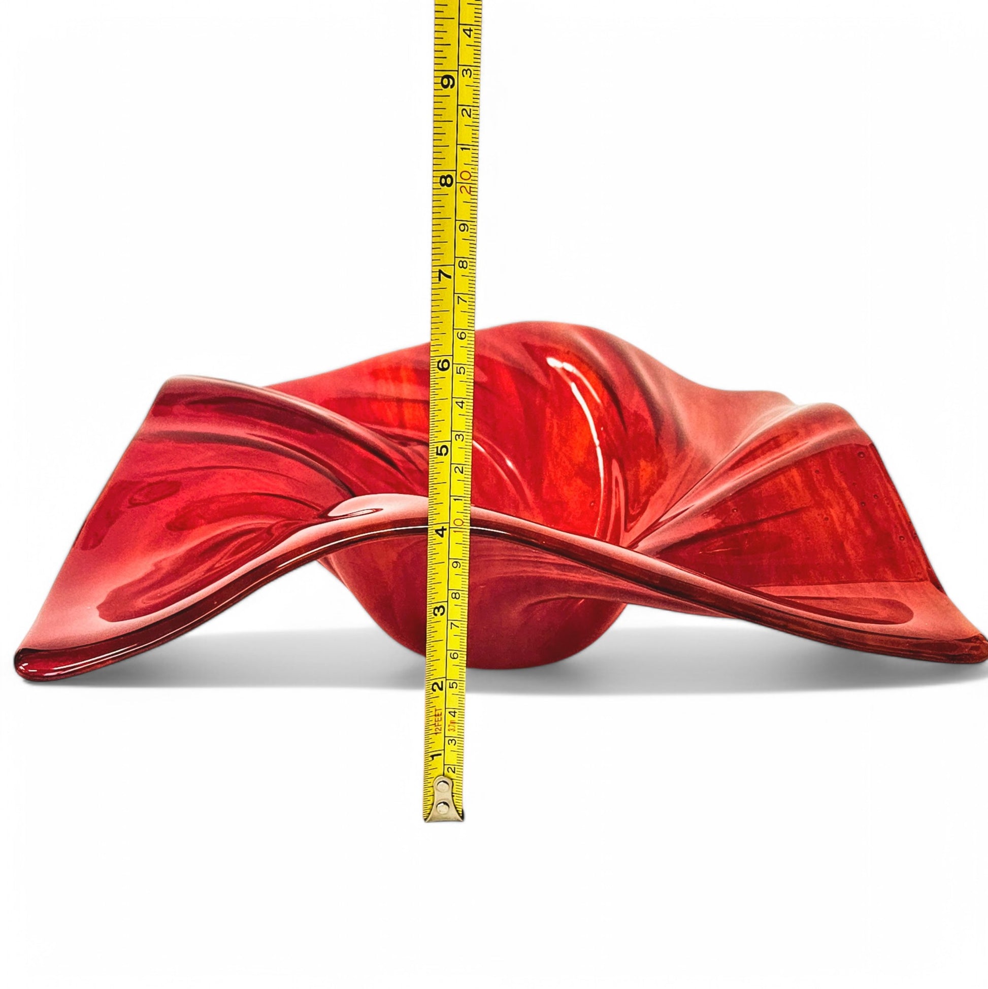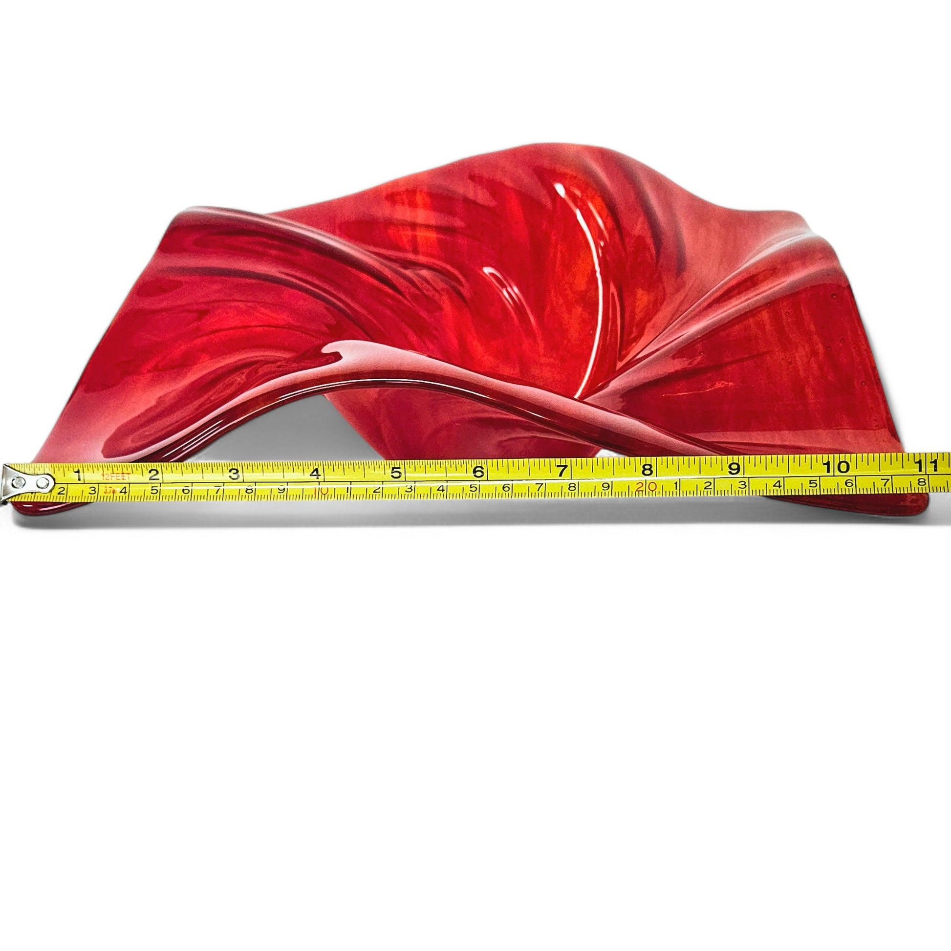 This handcrafted, modern glass art wave bowl in orange and red would be a stunning piece of art that combines elegance, craftsmanship, and contemporary design to any home decor. The bowl has a square, wave-like shape, with undulating curves that suggest movement and fluidity.