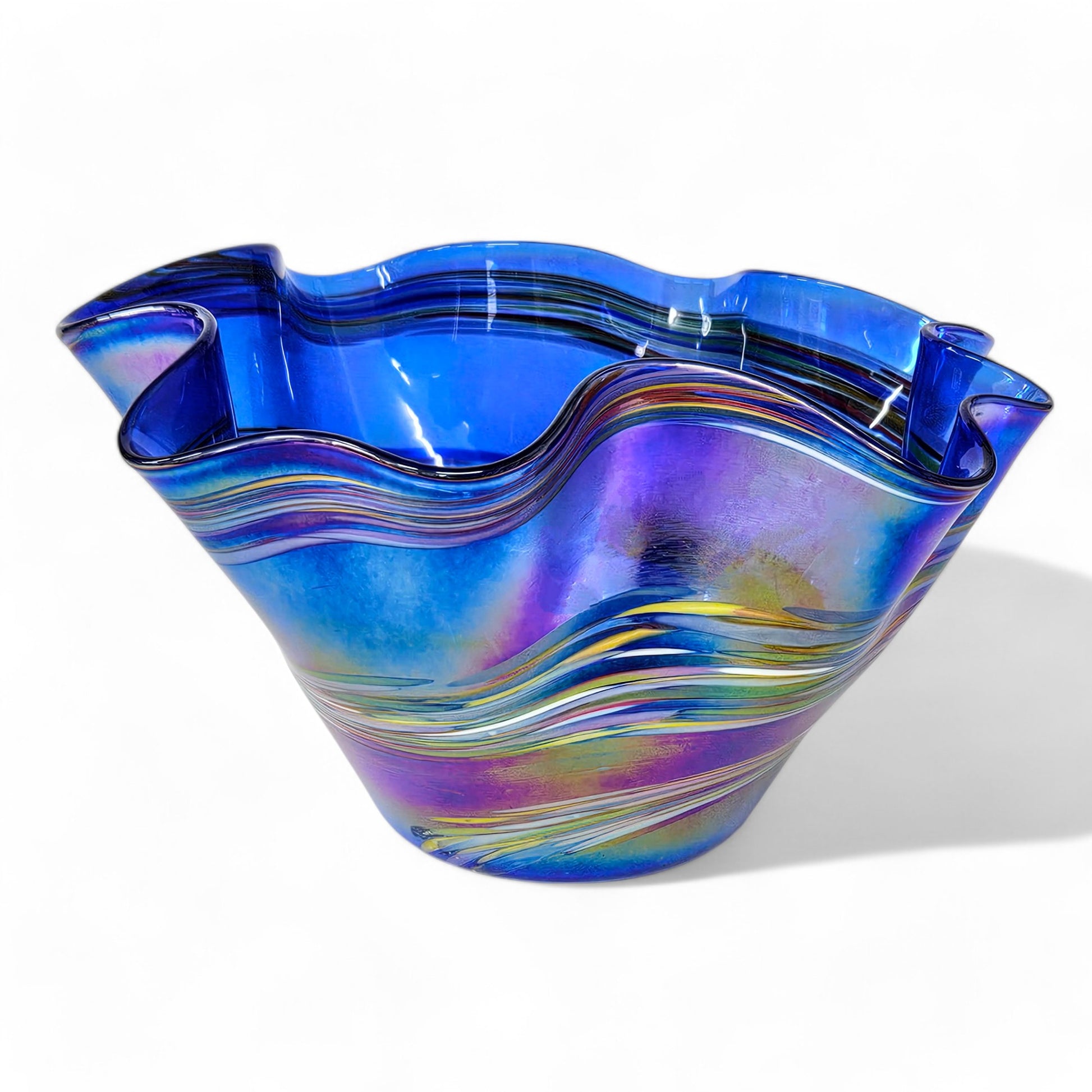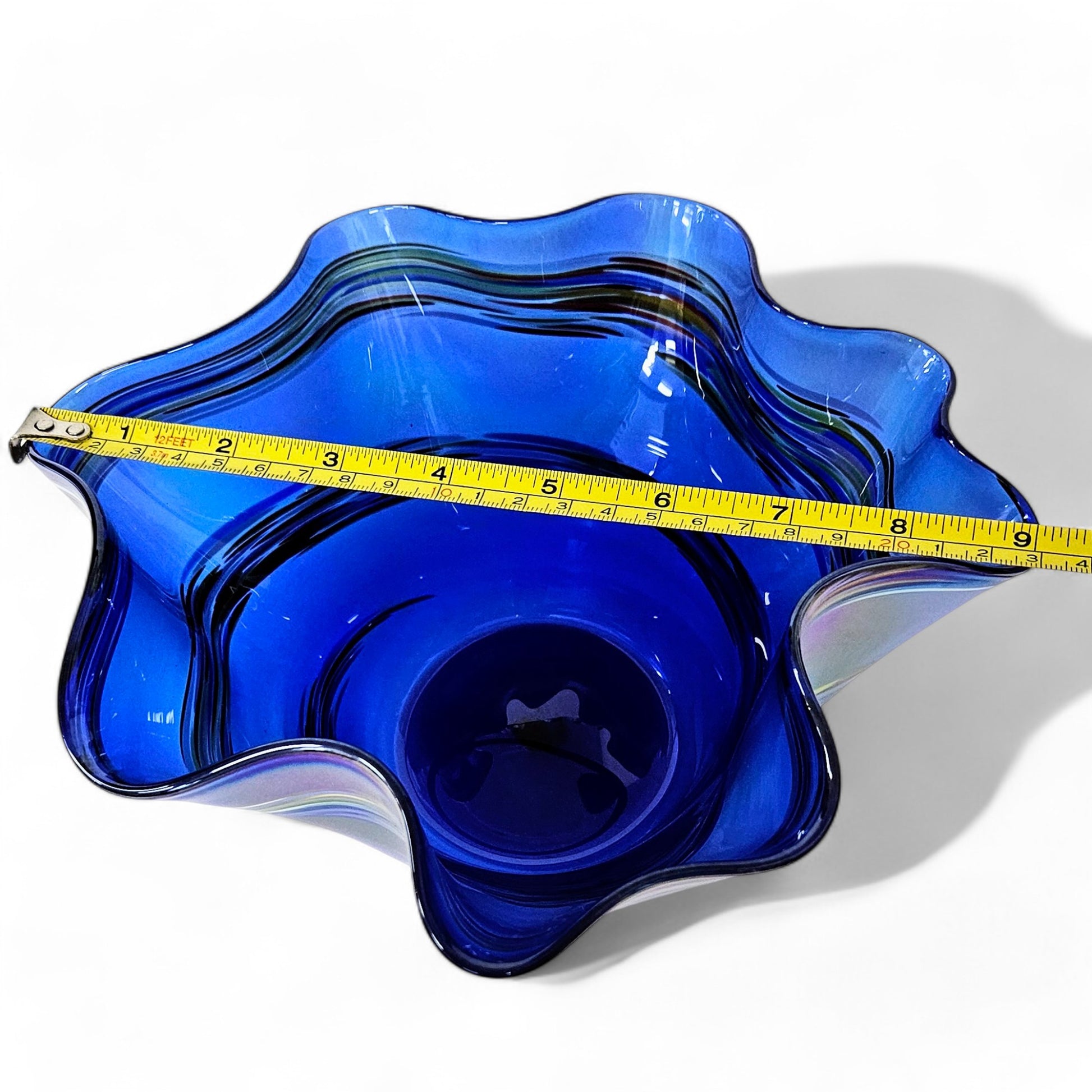 Iridescent Blown Glass Art Wave Bowl in Cobalt Blue