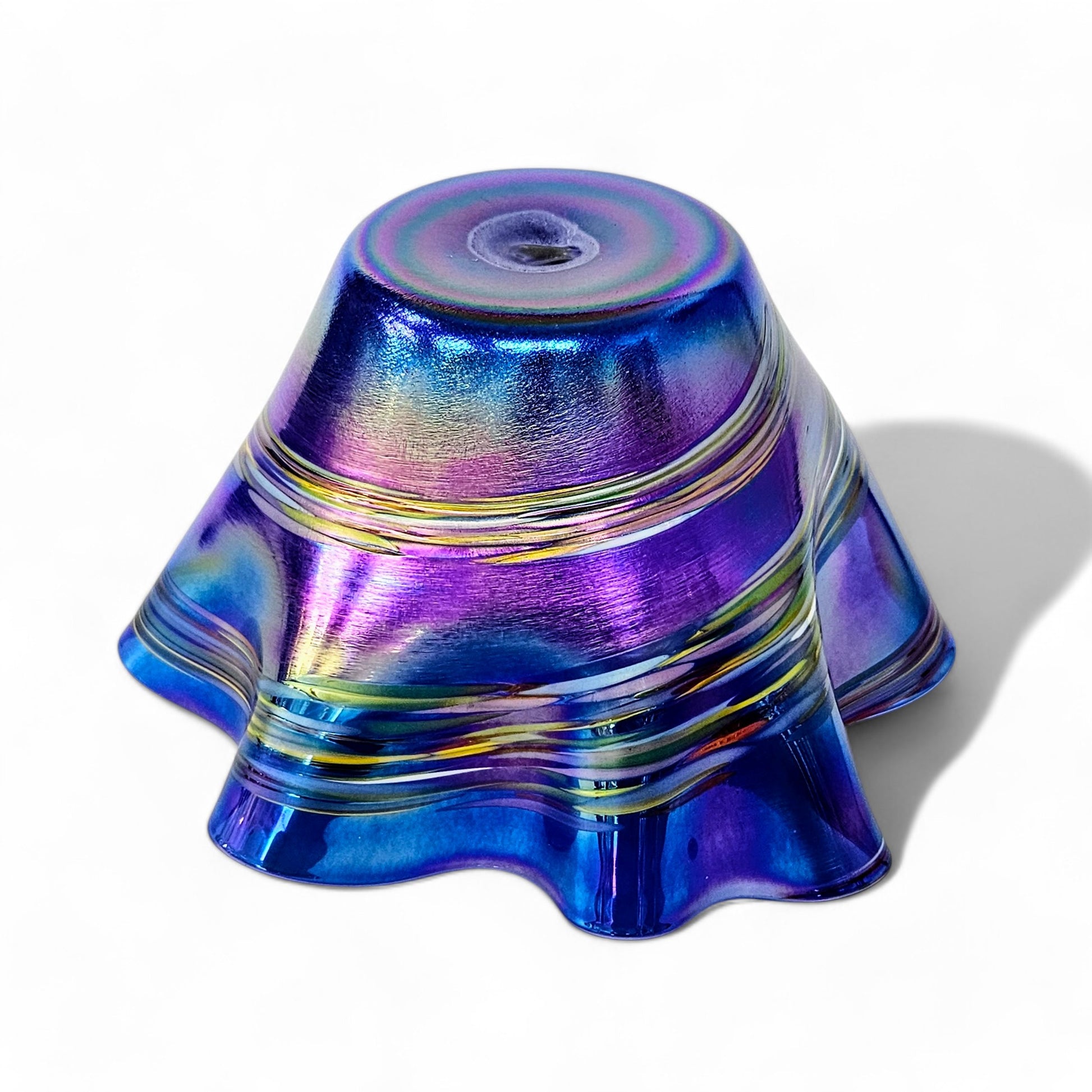Elevate your décor with this exquisite iridescent blown glass wave bowl, a true work of art crafted in the 1990s. This captivating piece features a metallic color-changing coating on a rich cobalt blue base, creating a dazzling interplay of light and color. The bowl measures 9 inches at its widest point and stands 5 inches high, making it a perfect centerpiece or accent for any space.