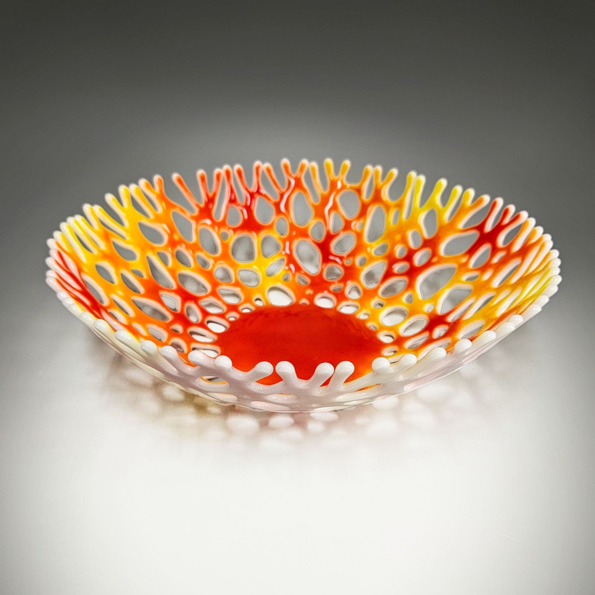 If you're looking for an impressive gift for a birthday, wedding or anniversary, think contemporary glass art. This gently sloping, fused glass, fruit bowl replicates sea coral in all its splendor. Done in bold red and bright yellow, it's backed by a soft white glass. The light plays off of it beautifully!