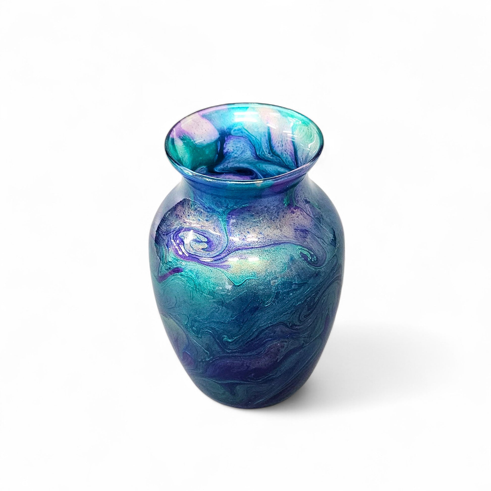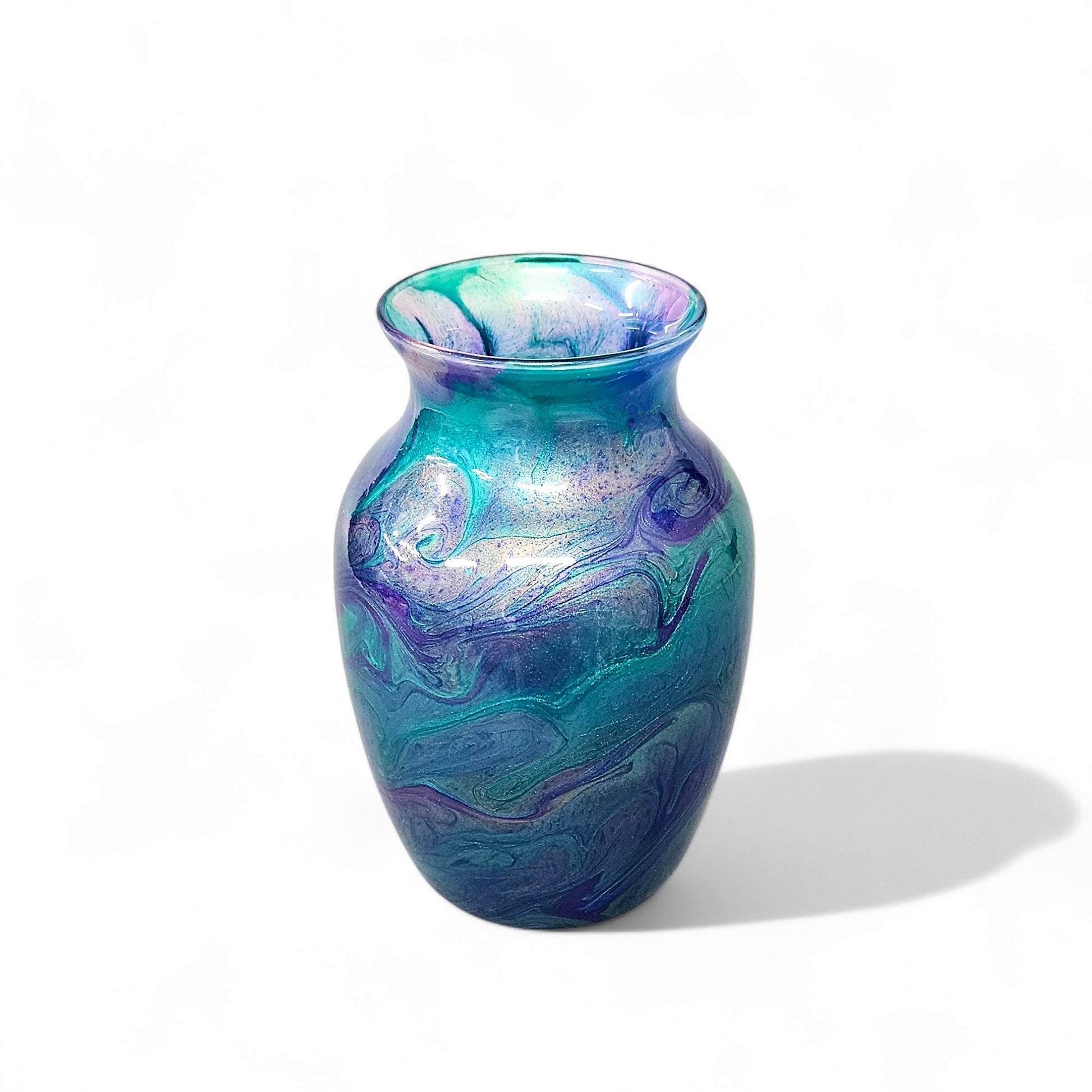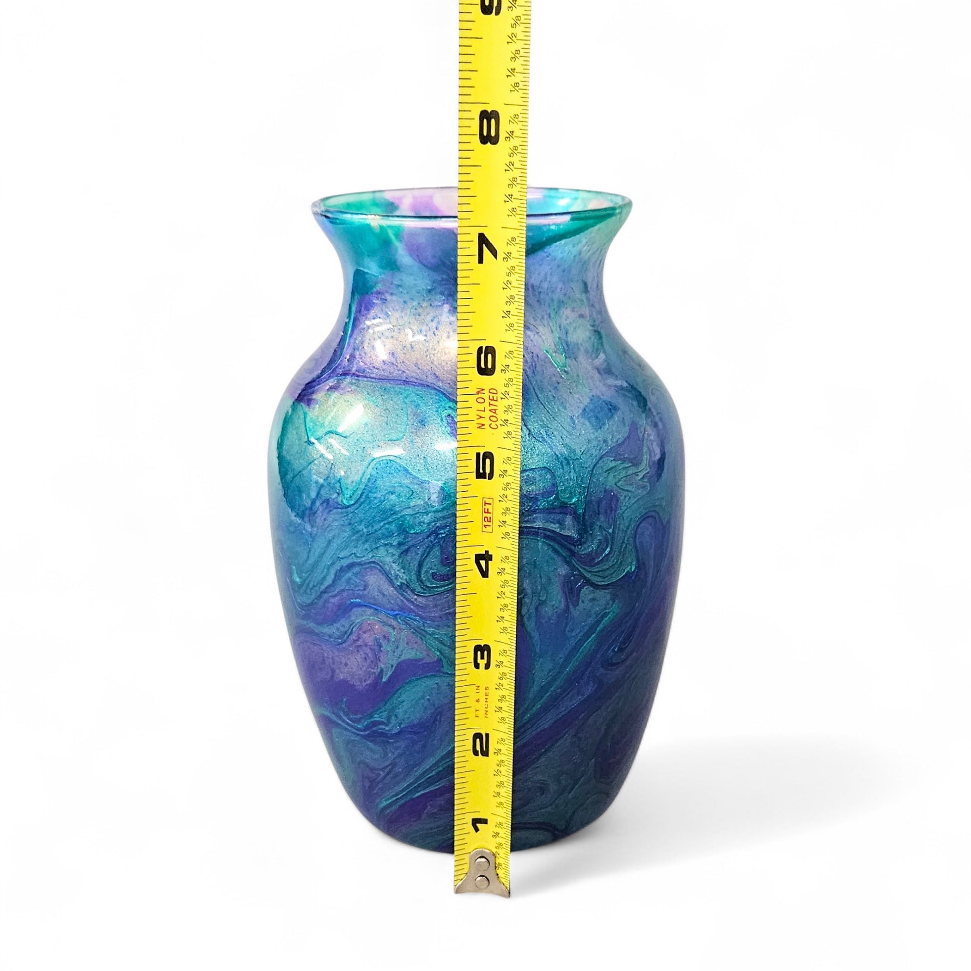 Each vase is one-of-a-kind piece. I have 2 of these available. The color mixes are identical but the flow patterns will differ slightly. If you have a choice between the two, just let me know.